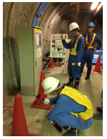 職員の方から概況説明をしていただいた後、作業着・ヘルメット・非常時のライト等を装着し、エレベーターに乗って地下350mの調査坑道に入坑しました。試験坑道で実施されている各種試験状況の説明を受けました。